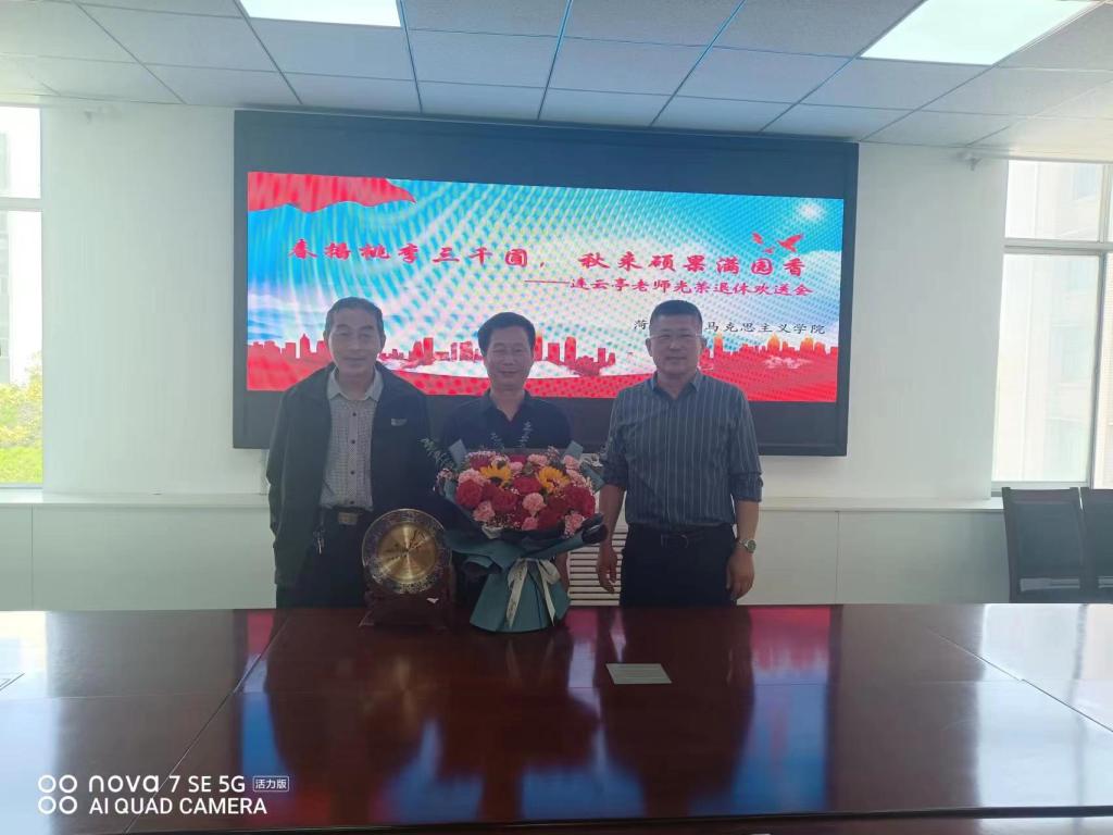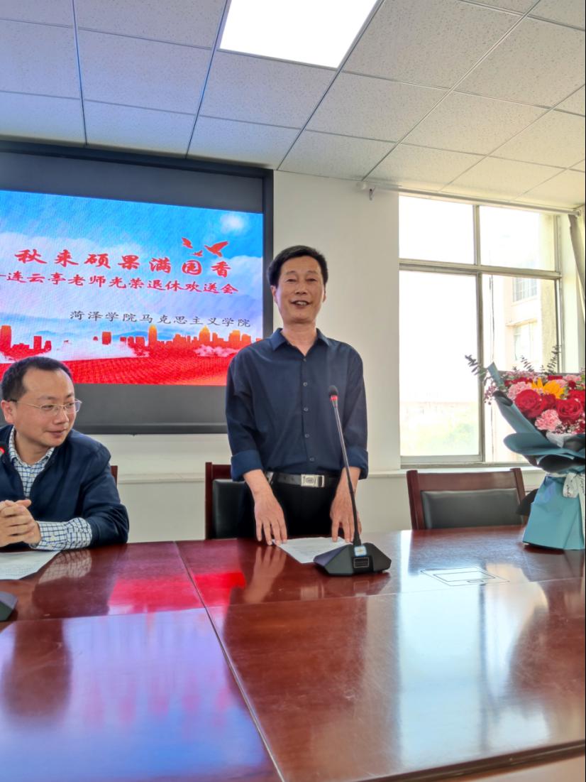 副院长李文政在致辞中满怀深情地回忆起和连云亭老师一起工作的点点滴滴,对连云亭老师在教育战线辛勤付出和无私奉献三十六年给予了高度评价,他希望连云亭老师退休后能继续为马院的教育事业建言献策,并祝愿连云亭老师退休后能身体健康,阖家幸福,万事如意。