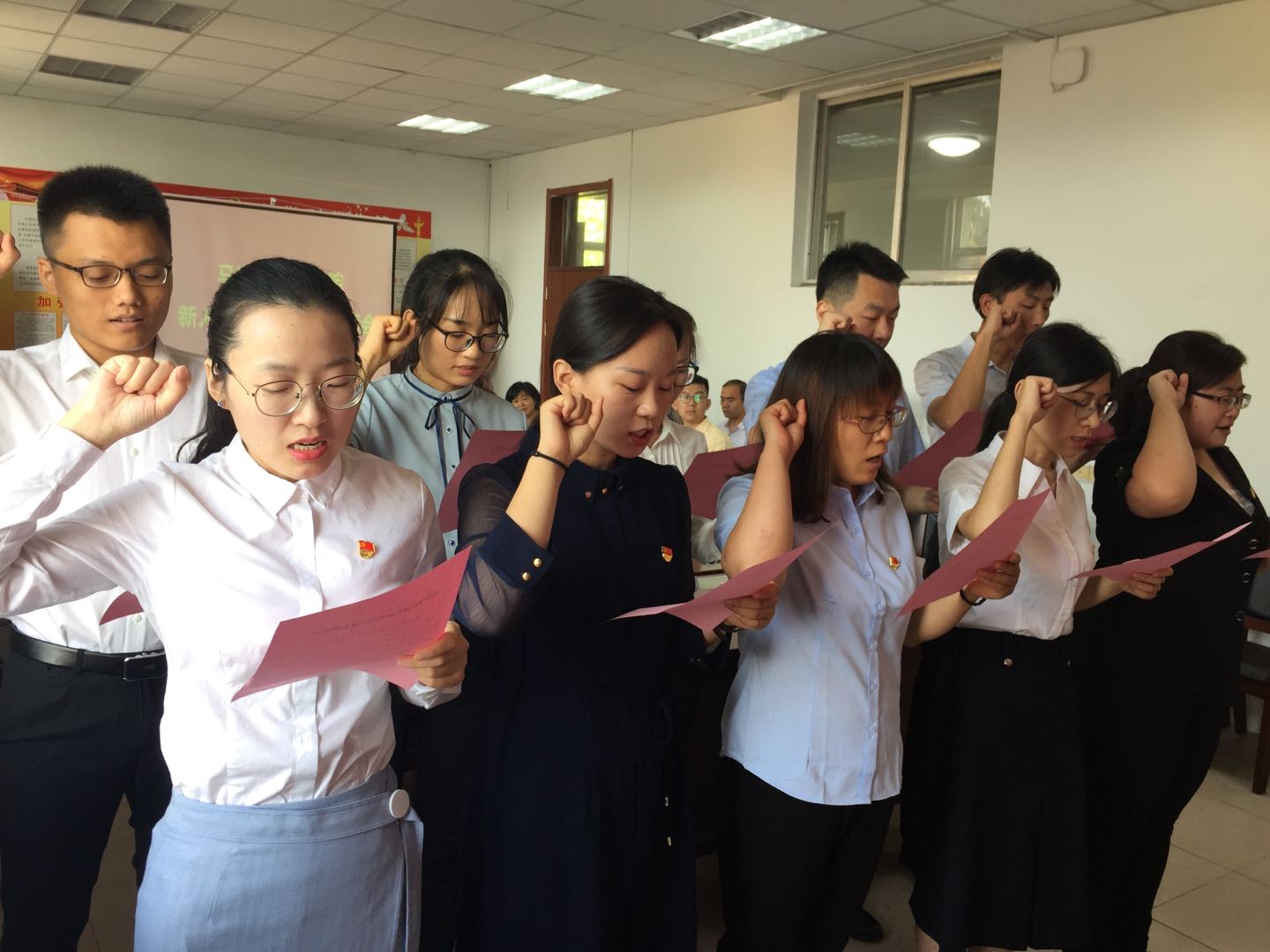 申存修书记在列队左前方带领诵读誓词。新入职的10位宣誓教师身着正装,仪态端庄,右手举拳,面对党旗,整齐列队,宣读誓词铿锵有力。
