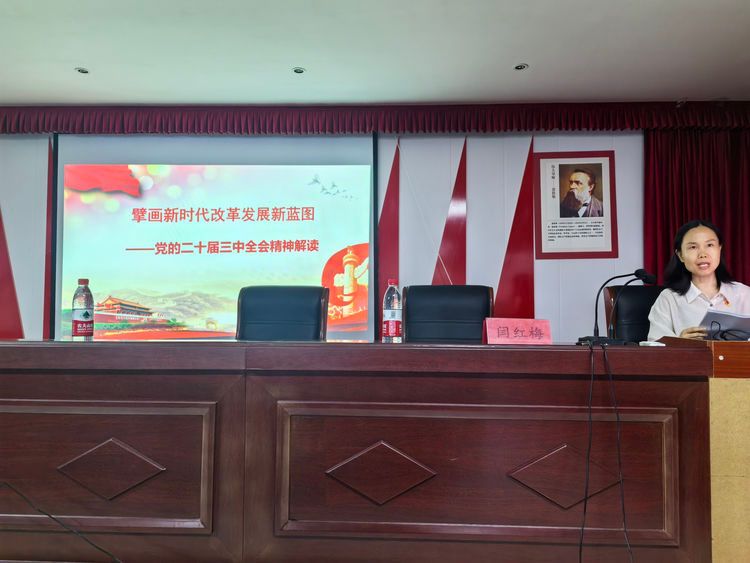 闫红梅副教授以《擘画新时代改革发展新蓝图》为题,围绕二十届三中全会召开的背景和重大意义、重点内容,以及牢牢把握改革正确方向要坚持的“六大原则”、三个方面对党的二十届三中全会精神进行了深入解读。