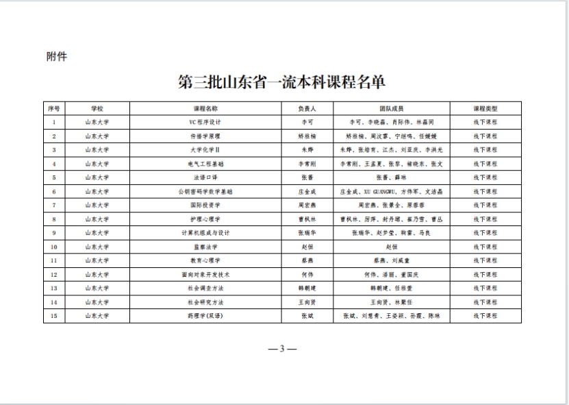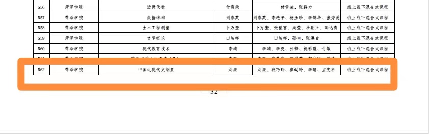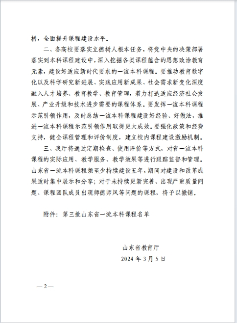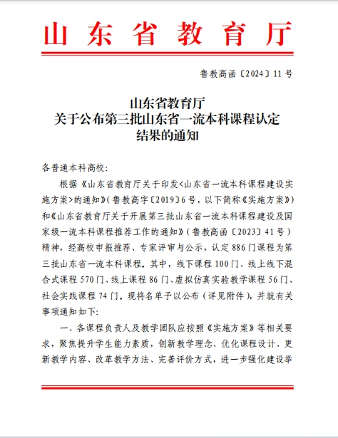 近日,山东省教育厅发布《关于公布第三批山东省一流本科课程认定结果的通知》(鲁教高函〔2024〕11号),共认定886门课程为第三批山东省一流本科课程。我院《中国近代史纲要》课程被认定为省级线上线下混合式一流本科课程。至此,我院已获批省级一流本科课程4门。