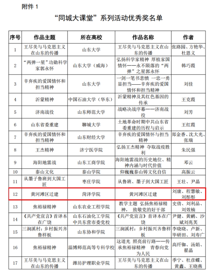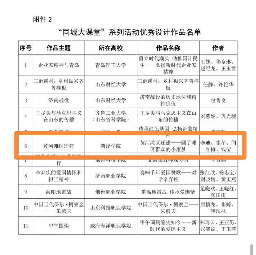 10月20日,由山东省学校思政课教学指导委员会组织的全省“同城大课堂”分选题教学设计大赛活动结果揭晓,bevitor伟德国际1946刘康、程慧敏、刘彤彤团队的《山东黄河滩区迁建》教学设计获评省“同城大课堂”系列活动优秀奖李迪、崔冬、闫红梅、钱莹团队的《黄河滩区迁建——圆了滩区群众的小康梦》被评为“同城大课堂”系列活动优秀教学设计作品。